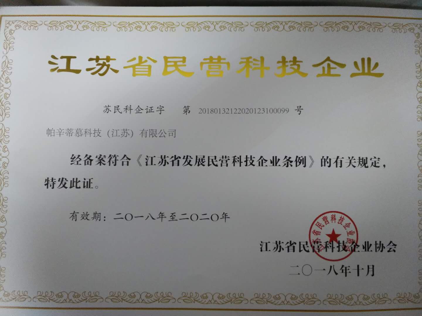 帕辛蒂慕科技(江蘇)有限公司榮獲江蘇省民營科技企業